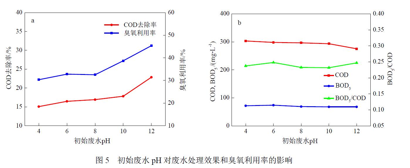 待處理廢水COD 為357.0 mg/L,BOD5/COD 為0.12。在進(jìn)氣臭氧質(zhì)量濃度為50 mg/L、RPB 轉(zhuǎn)速為1500 r/min、氣液比為5︰1、廢水溫度為20.0 ℃的條件下進(jìn)行一級(jí)處理,考察初始廢水pH 對(duì)廢水處理效果和臭氧利用率的影響,結(jié)果如圖5 所示。