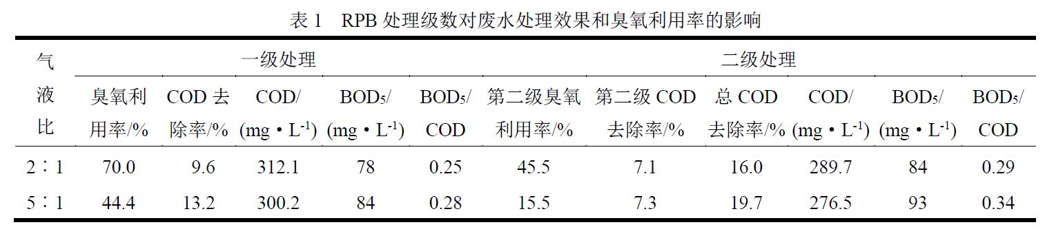 待處理廢水COD 為340.0 mg/L,BOD5/COD 為0.18。在進(jìn)氣臭氧質(zhì)量濃度為50 mg/L、RPB 轉(zhuǎn)速為1500 r/min、初始廢水pH 為7.77、廢水溫度為24.7 ℃的條件下,考察處理級(jí)數(shù)對(duì)廢水處理效果和臭氧利用率的影響,結(jié)果如表1 所示。