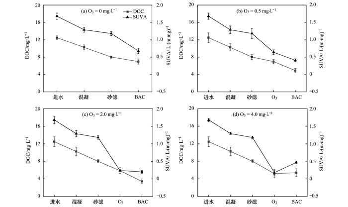 對(duì)不同的臭氧濃度條件下沿程出水的DOC和SUVA進(jìn)行測(cè)定, 結(jié)果如圖 1所示。
