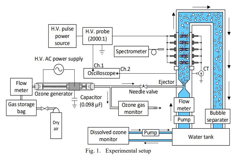 圖1顯示了一個(gè)實(shí)驗(yàn)裝置。該系統(tǒng)包括臭氧發(fā)生器、噴射器、泵、脈沖電源和脈沖放電裝置。臭氧是用填充玻璃微珠(微珠尺寸:6 mm)的DBD裝置產(chǎn)生的。臭氧發(fā)生器由一個(gè)逆變電源(4210,NF公司)和一個(gè)升壓變壓器(YHT-15K-0.5K, Yamabishi Electric)施加交流高壓。使用高壓探頭(EP-50K,日新脈沖電子公司)測(cè)量臭氧發(fā)生器的施加電壓(V)。電荷(q)是通過(guò)積分電容器上的電壓降(0.098µF)來(lái)測(cè)量的。用V-q利薩若圖面積乘以工頻計(jì)算臭氧發(fā)生器的放電功率。臭氧氣體濃度采用紫外吸收型臭氧監(jiān)測(cè)儀測(cè)量。干燥空氣(絕對(duì)濕度:119.3 mg m−3)作為臭氧發(fā)生器的氣源。通過(guò)針閥調(diào)節(jié)臭氧發(fā)生器的氣體流量為2.0 L min−1。