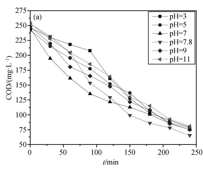 在催化劑投加量為 30%, 臭氧流量為 3 L/min的條件下, 設置廢水初始 pH 分別為 3, 5, 7, 7.8 (不調 pH), 9 和 11, 探討廢水初始 pH 對催化臭氧化降解效果的影響, 結果如圖所示。
