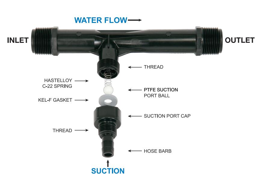 Mazzei射流器是非常高效,緊湊的差壓射流器與內部混合葉片。當專利射流器的進出口端口之間存在足夠的壓力差時,在射流器體內產生真空,通過吸入口開始吸入。