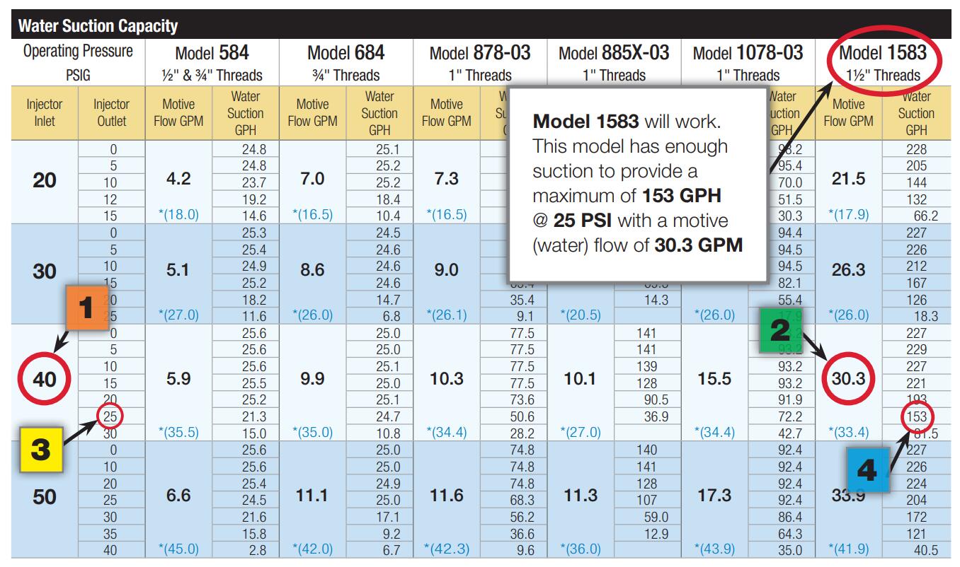 一位種植者計劃通過旁路向他的灌溉系統注入120 GPH(2 GPM)的液體肥料。他有40 PSI可用,下游需要保持25 PSI。他還希望通過旁路的水流量保持在每分鐘30加侖左右。根據種植者的要求,請參考下面的注入器性能表: