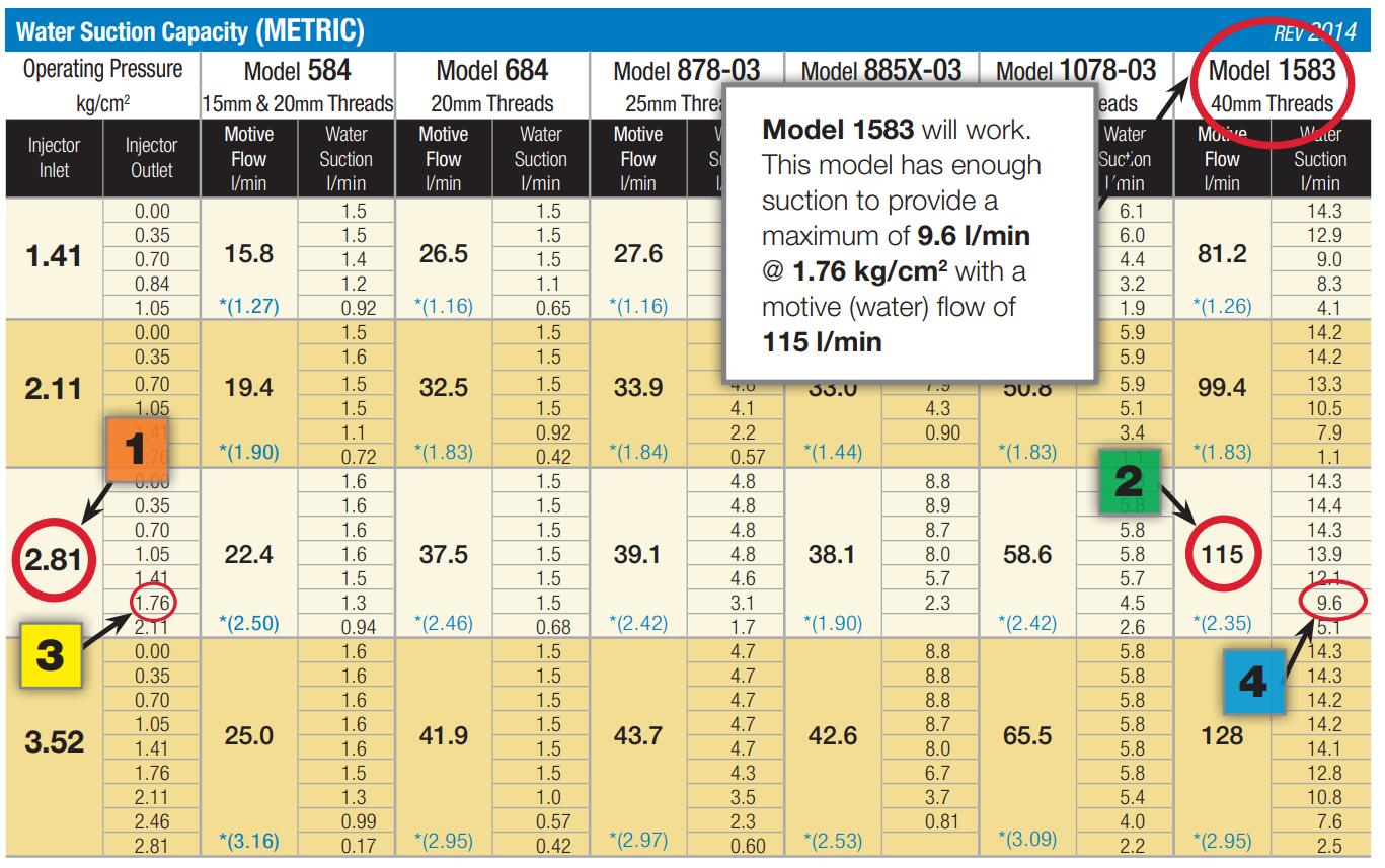 一位種植者計劃每分鐘通過旁路向他的灌溉系統注入7.57升的液體肥料。他有2.81 kg/cm2可用,下游需要保持1.76 kg/cm2。他還希望通過旁通的水流量保持在116升/分鐘左右。根據種植者的要求,請參考下面的注入器性能表: